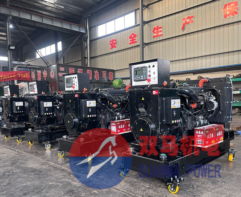 4台移动发电机,选用开架式潍柴发电机组配置移动轮,小巧便捷。不过这种移动方式,只适用于功率不大,机组重量不重的小功率柴油发电机组。
